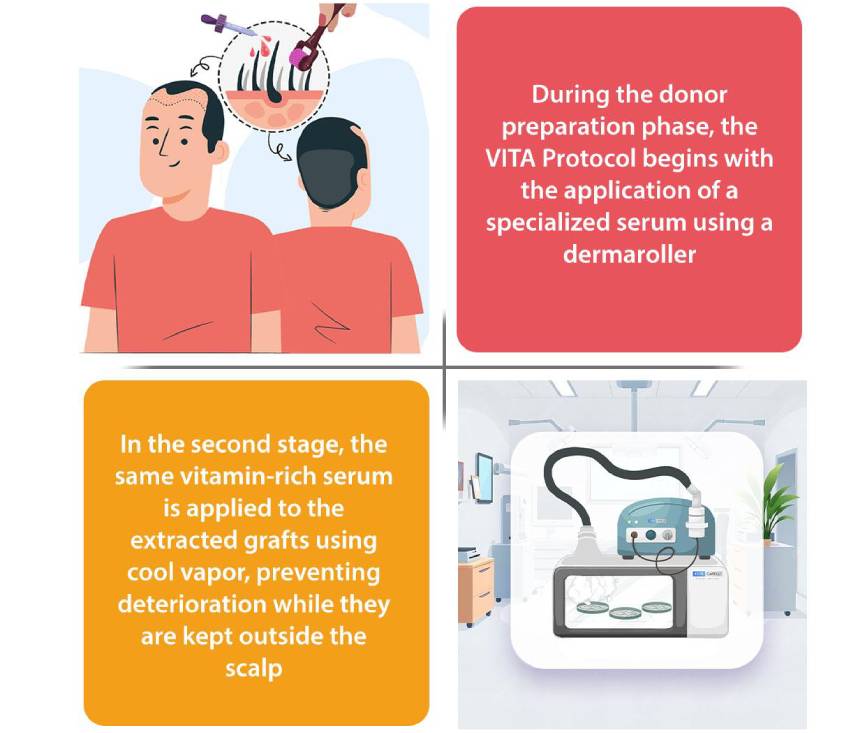 This protocol combines highly enriched components, including amino acids, vitamins, growth factors, and ATP, to nourish hair follicles. In the first phase, a serum solution is applied to the scalp via microchannels opened with a dermaroller massage tool, allowing grafts to receive the nutrients they need more effectively. In the second phase, cold air vapor must be applied to the grafts after they are harvested and during the waiting period in Vita Serum, combined with a saline solution to increase their survival rate while they are maintained.